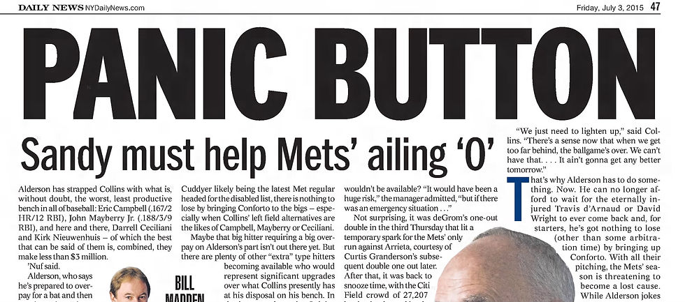 In a story headlined “Time to Hit…The Panic Button,” Bill Madden wrote: “Sandy Alderson can joke all the wants about the media being Panic City, but that’s what this is right now. The lineup Terry Collins was forced to throw out there Thursday…was embarrassing…All season long, Alderson has sapped Collins with what is, without a doubt, the worst, least productive bench in all of baseball.”